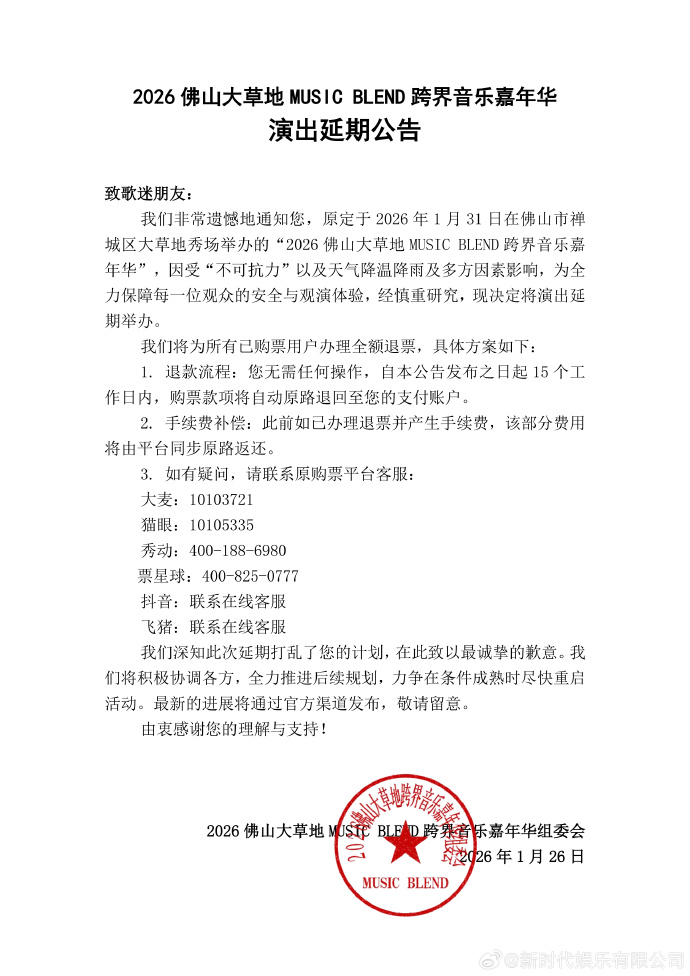 1月26日,2026佛山大草地MUSIC BLEND跨界音乐嘉年华专揽方新期间文娱有限公司发布上演延期公告。