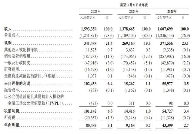 于往绩纪录期间,公司的收入来自:(i)国内电商品牌运营,包括商品销售及做事提供;(ii) 总代理及授权品牌运营;以及(iii)外洋电商品牌运营。公司的收入由2023年的东说念主民币15.93亿元减至2024年的东说念主民币13.79亿元,主要由于国内电商品牌运营的收入下跌。公司的收入由 2024年的东说念主民币13.79亿元增至2025年的东说念主民币16.08亿元,主要由于外洋电商品牌运营收入增多。
