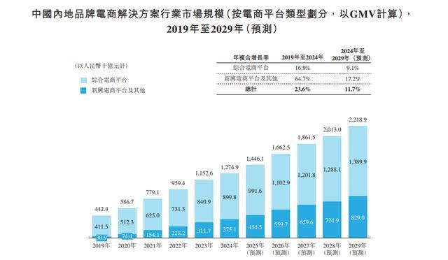 2024年,中国内地品牌电商处理决策行业的市集鸿沟(以GMV计)达到东说念主民币1.3万亿元,筹商2024年至2029年期间将以11.7%的年复合增长率增长,到2029年将达到东说念主民币2.2万亿元。线上渠说念渗入率的抓续进步,加上品牌加快鼓励数字化转型策略,陆续推动电商往来量的增长。品牌电商处理决策公司凭借熟习的渠说念资源、运营警告及数据启动智力,协助品牌进步流量获取效果和客户留存率,从而增强品牌在各线上平台的竞争力。