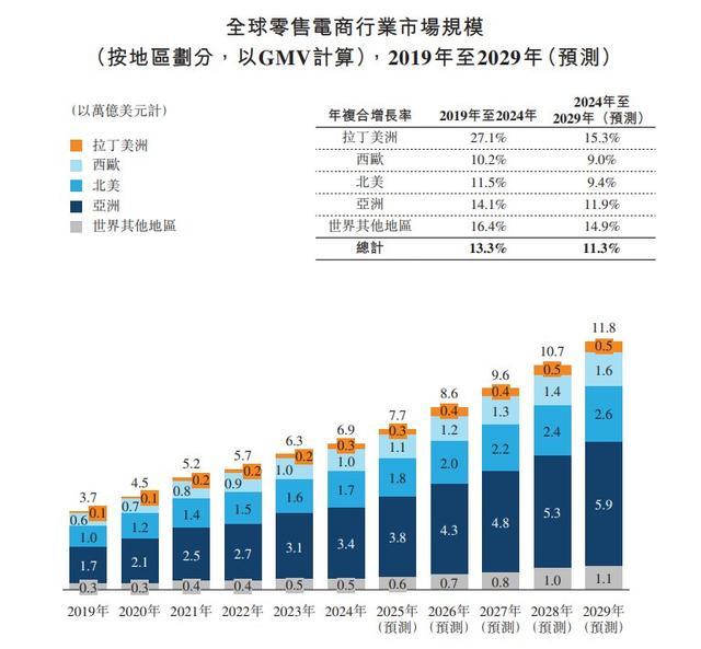 连年来,寰球零卖电商行业(即通过数字化平台向消耗者销售商品)抓续快速延长。在零卖渠说念抓续数字化、物流和支付基础才略日益完善、消耗者对网购收受度不休提高以及移动互联网快速普及的推动下,寰球零卖电商往来量在主要隘区保抓抓续增长。凭证弗若斯特沙利文远程,以GMV推敲,寰球零卖电商行业的市集鸿沟由2019年的3.7万亿好意思元增至2024年的6.9万亿好意思元,UEDBET官网年复合增长率为13.3%。2024年,以GMV推敲,中国内地是寰球最大的零卖电商市集。筹商已往,寰球零卖电商市集鸿沟筹商将陆续扩大,到2029年将达到约11.8万亿好意思元,2024年至2029年的年复合增长率为11.3%。