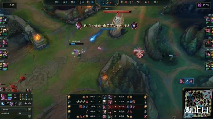 第一局:BLG下路开局就线杀WE双东说念主组,Xun皇子节律拉满,knight发条全场游龙。