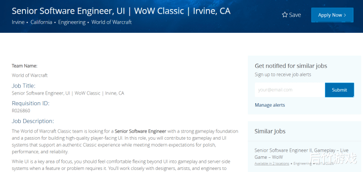 在怀旧服团队发布的两则招聘缘由中,一个是招“高档软件工程师(UI标的)”,条件应聘者具备“8年以上软件工程岗亭或同等规模的专科使命警告”,职责范围包括“缠绵并已毕千般玩法功能及面向玩家的UI界面特色,以撑握《魔兽寰宇》怀旧服的游戏系统与骨子。”
