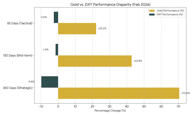 把柄BCA Research的估量步伐,在一个无缺的年度交游周期内,好意思元指数从107.96回落至97.42,跌幅仅为9.76%;而同期金价却从每盎司2875好意思元飙升至2月3日的4905好意思元,涨幅逾越70%。若以半年为不雅察窗口,博亚体育app中国官方入口这一背离更为显耀,好意思元指数微跌1.38%,金价却暴涨42.84%,两者变动倍数比达到31倍。