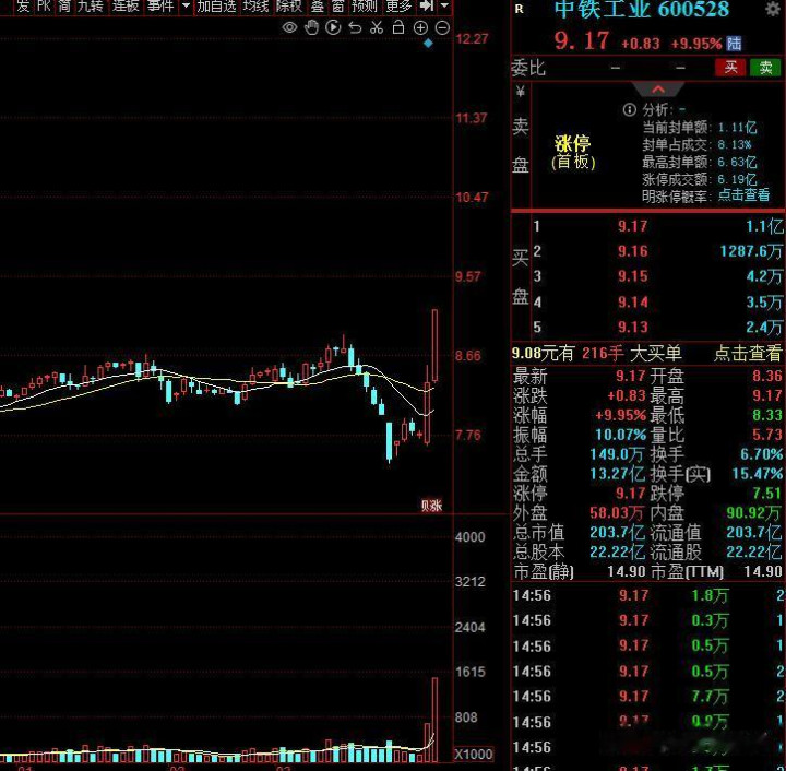 第三家:中铁工业,今天涨停板,股价9元操纵,市值203亿,主力资金流入3亿。