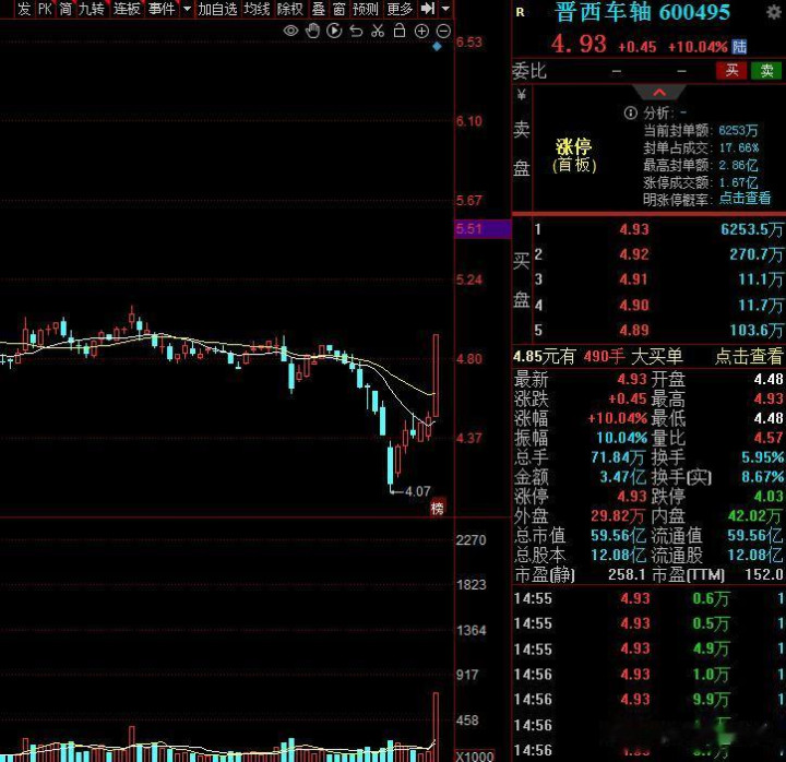 第二家:晋西车轴,今天首板涨停,股价5元操纵,市值60亿,主力资金流入1亿。