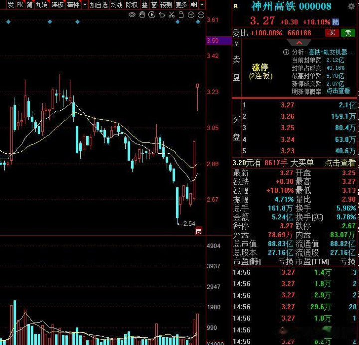 第一家:神州高铁,走出二连板,股价3元操纵,市值88亿,主力资金流入1.4亿。