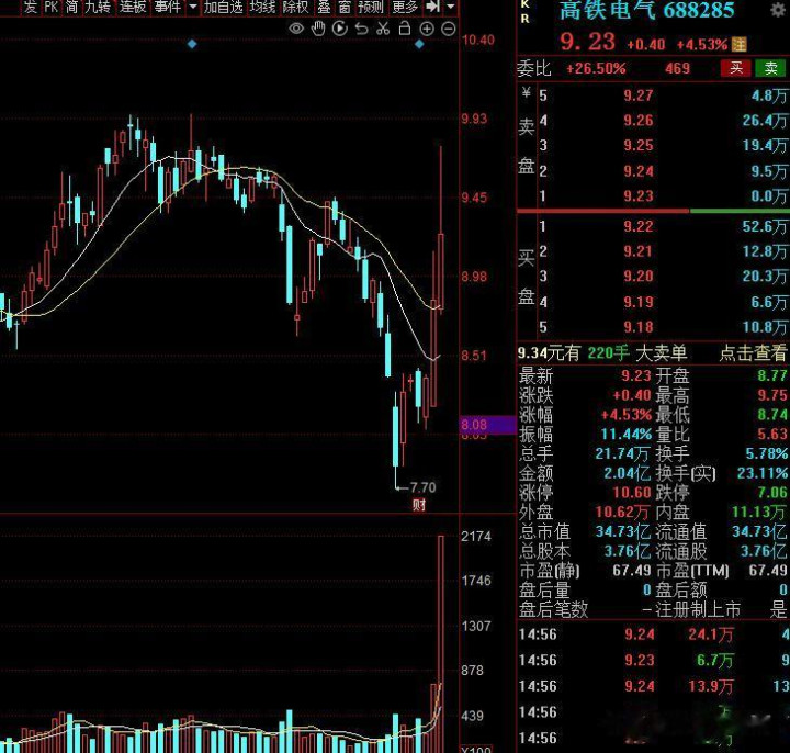 第四家:高铁电气,走出二个大阳线,股价9元操纵,市值34亿,主力资金流入1500万。