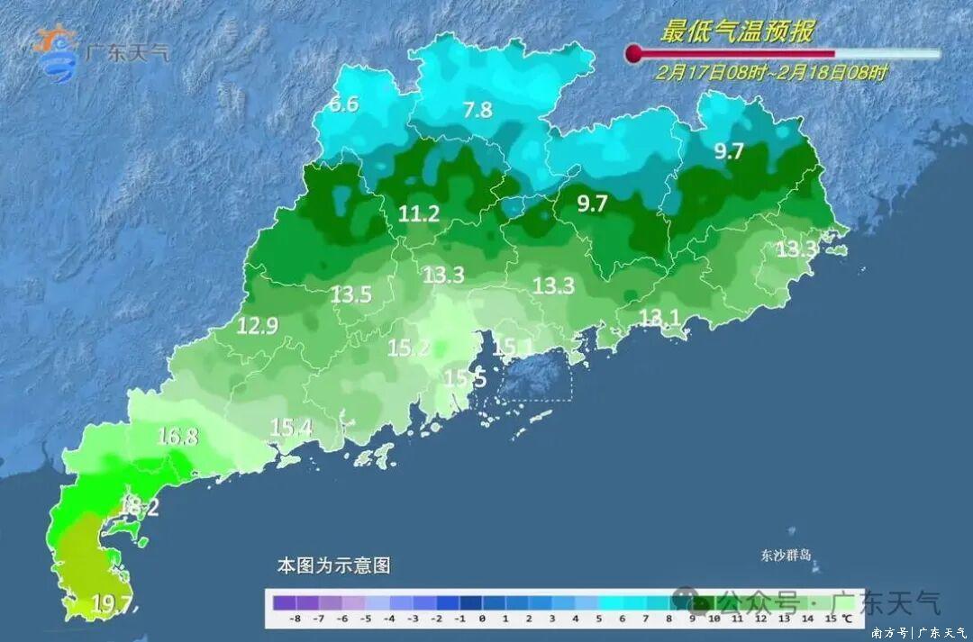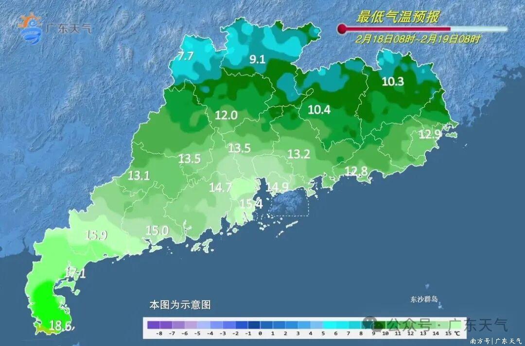 具体来看,18日(初二),粤西市县多云间阴天,其余市县多云间好天,早晚寒凉。黎明最低气温:粤北市县7~10℃(高海拔山区2~6℃),珠江三角洲北部和粤东市县10~14℃,雷州半岛市县17~20℃,其余市县14~17℃;18日日间运行起气温回升。