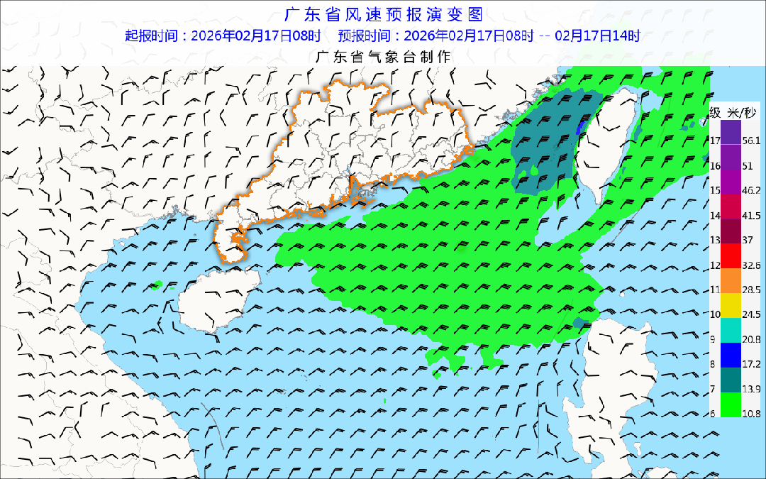 海上天气预告:17-18日,广东省海面有东北风6~7级,阵风8级;琼州海峡:17昼夜间-19日黎明,东北到东风5-6级阵风7级。