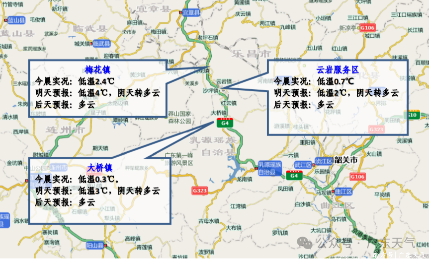 今天(17日)黎明,广东大部迎来降温,最低气温:清远、韶关、河源、肇庆北部、梅州北部市县7~10℃,粤西和珠江三角洲中南部市县16~20℃,其余市县11~15℃,其中韶关乐昌全省最低,唯有7.2℃。