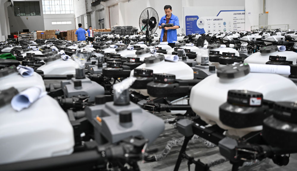 2025年6月26日,职责主谈主员在集合飞机集团深圳基地植保无东谈主机仓库内巡查。新华社记者 邓华 摄