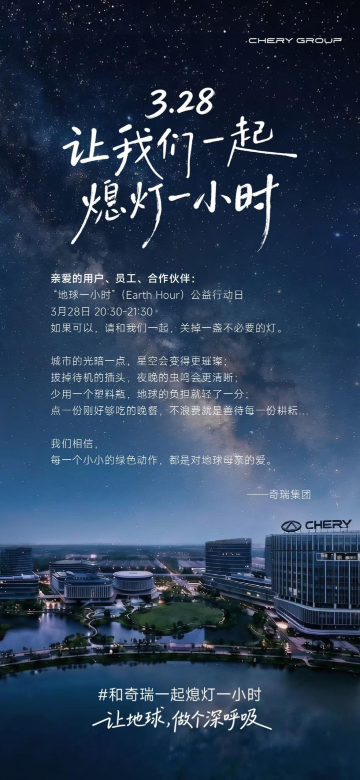 3月28日,当专家堕入“地球一小时”的迷蒙,咱们时时会联思到风力和太阳能的间歇性问题——莫得风,风机停转;莫得太阳,光伏板千里默。关于新动力汽车而言,淌若充电的泉源还是是火电,那么“绿色出行”似乎总带着一点无奈。然而,奇瑞汽车却在这一痛点上,下了一盘大棋。